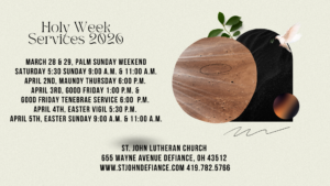 Thank you for your continued support of the ministries at St. John Lutheran Church, Defiance, Ohio.