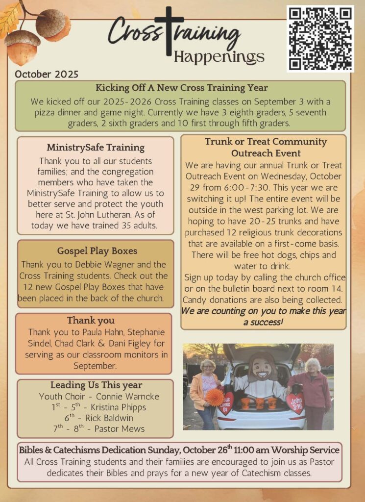Cross Training is our Confirmation program here at St. John Lutheran. Our goal is to build up students with the knowledge about their faith in Christ so that they can share it with the world. Throughout this year we will grow together through fellowship, special events, service projects, icebreakers, team-building